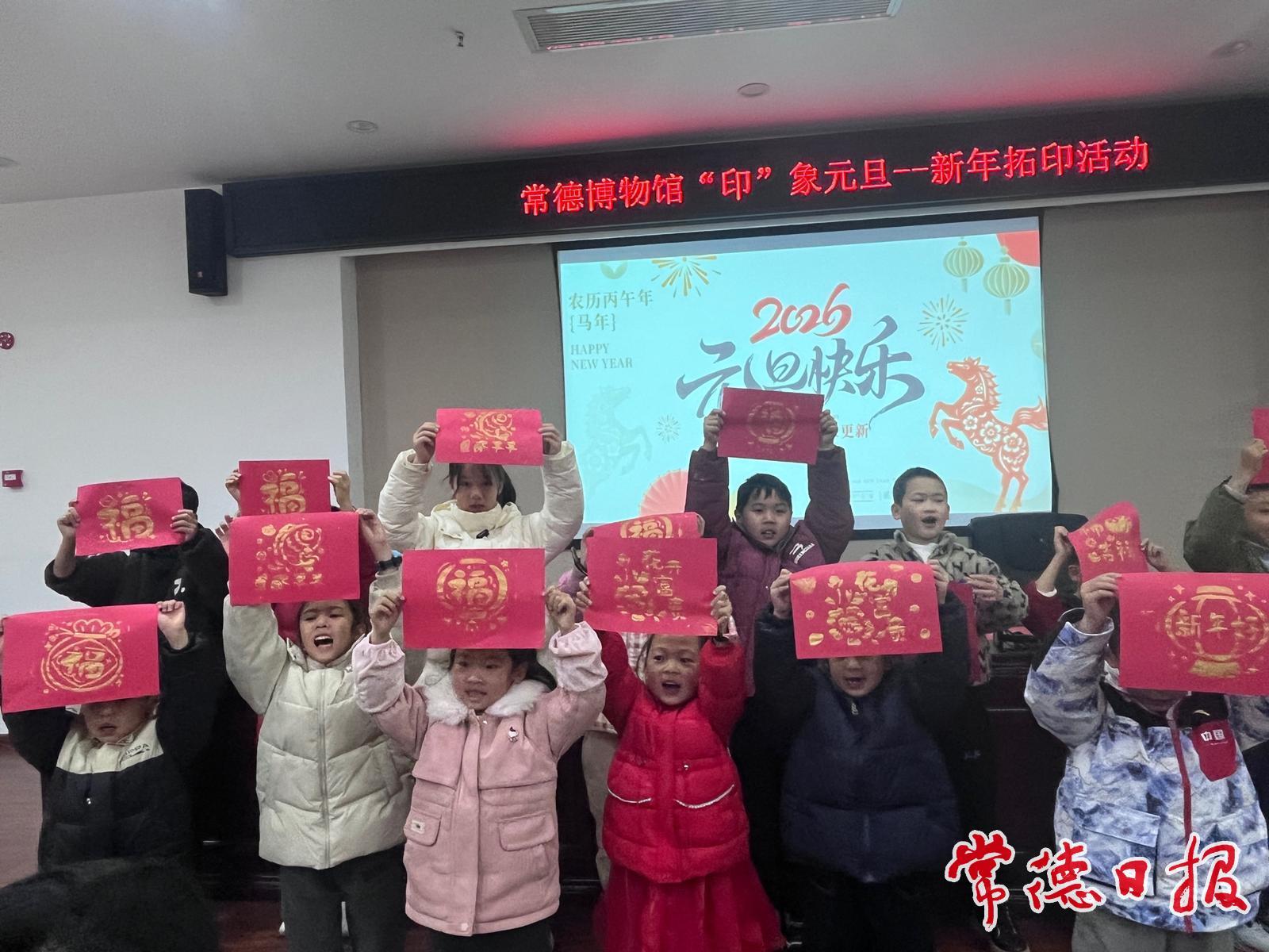 “快看!我的拓印做好了!”“蘸粉要轻一点才均匀哦”……2026年1月1日元旦佳节,常德博物馆二楼多功能会议室里金粉飘香、笑语盈盈。20余名6至12岁的孩子围坐桌前,手持拓包专注地在红色宣纸上轻轻拍打,古老的吉祥纹样随着金色拓粉慢慢晕染清晰。这场“印”象元旦——新年拓印活动,让孩子们用最传统的非遗技艺,为崭新的一年拉开序幕。