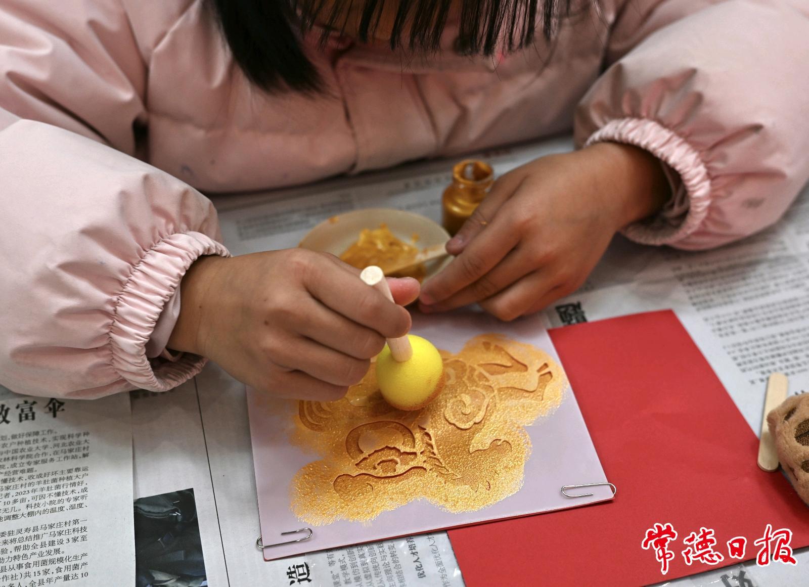 活动现场,指导老师向参与者讲解:“马,寓意着奋进与活力。今天,我们通过拓印,将这份吉祥寓意转化为可触摸的作品,既是非遗文化的‘活态传承’,也为家庭留下独特的元旦记忆。”在老师与家长的悉心指导下,孩子们兴致盎然地投入创作:固定模板、铺纸拍打、均匀上色……随着拓包一起一落,宣纸上逐渐显现出骏马的矫健轮廓。
