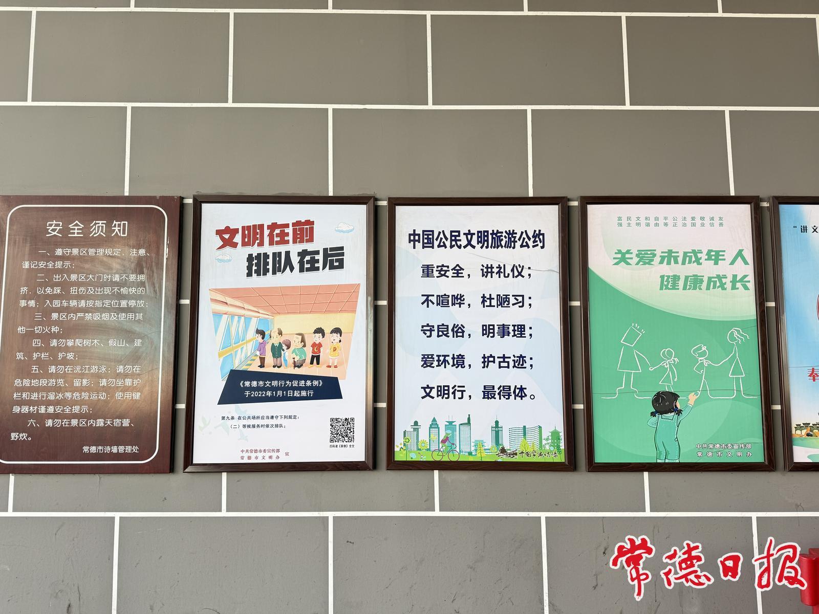 常德诗墙公园门口,《常德市文明行为促进条例》《中国公民文明旅游公约》海报十分醒目