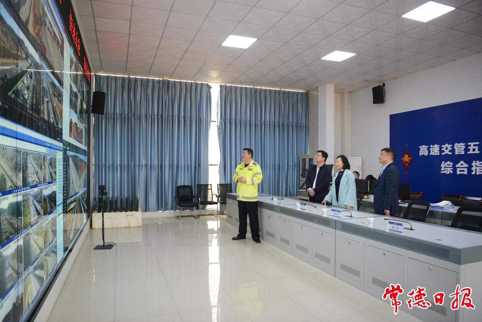 在高速交管五支队柳叶湖大队,陈华通过数字大屏了解常德境内高速路况、车流量及无人机巡查等情况。她要求借助大数据与智能化手段,加强与物流企业的数据共享,利用路面预警系统与无人机实现路况实时传输和快速处置;要依托春运检查站加强对“两客一危”车辆监管,严查绕行逃避检查、占用应急车道等违法行为,确保道路畅通。
