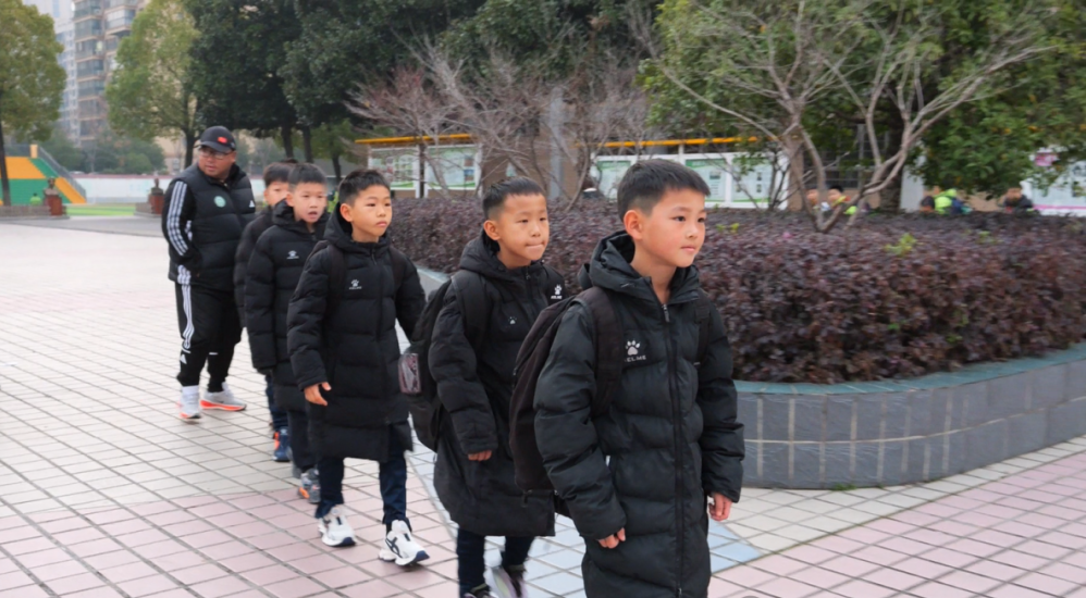 出征现场,身着统一队服的足球小将们背上背包,在教练、家长与师生的簇拥下踏上征程,小将们脸上带着些许稚嫩,眼神却满是坚定。