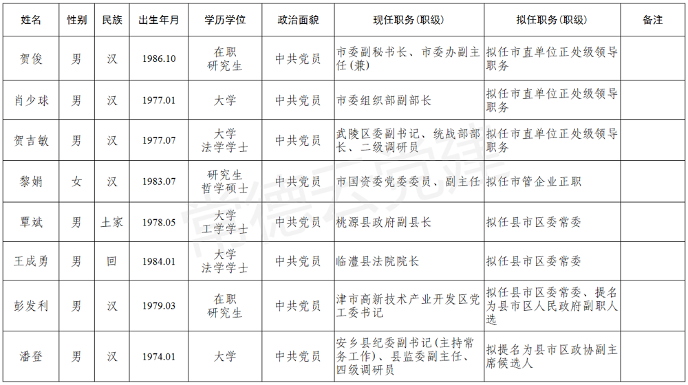 为了加强对干部选拔工作的监督,提高识别和任用干部的准确程度,现对市委常委会会议研究决定的下列拟任人选(候选人人选、提名人选)进行任前公示: