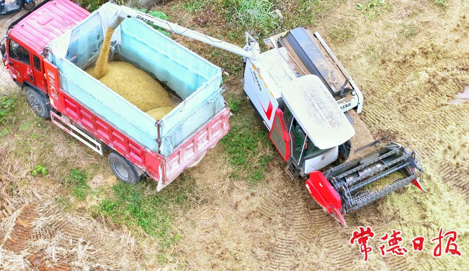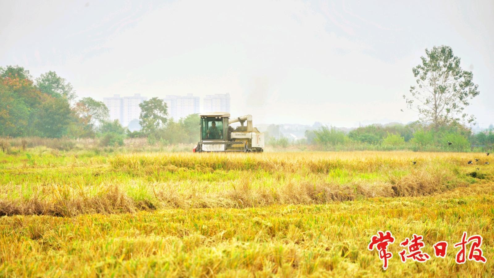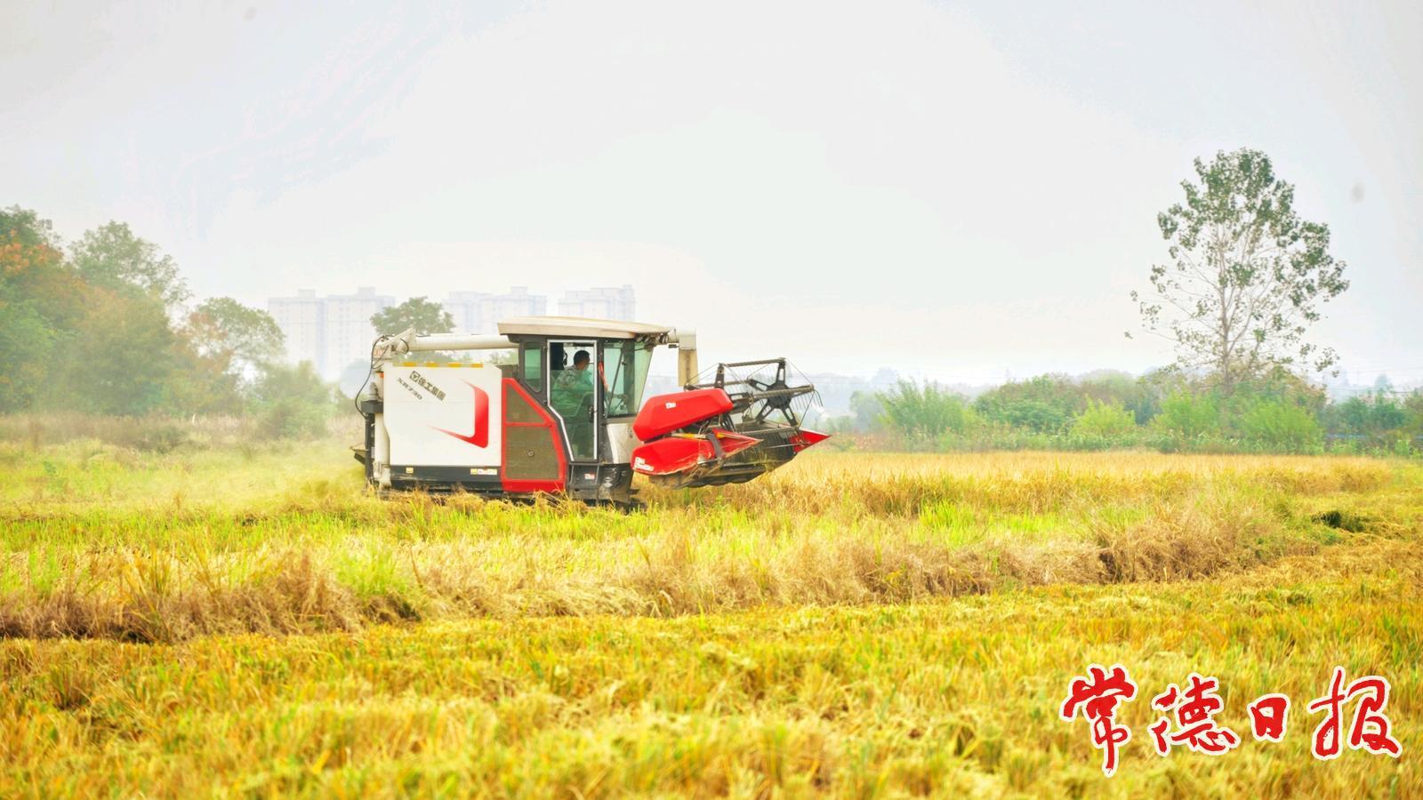 11月1日,柳叶湖旅游度假区白鹤镇同富桥村,56岁的种植大户郑胜飞正抢抓晴好天气,加紧收割晚稻,预计2天收割完毕,亩产约1000斤水稻。