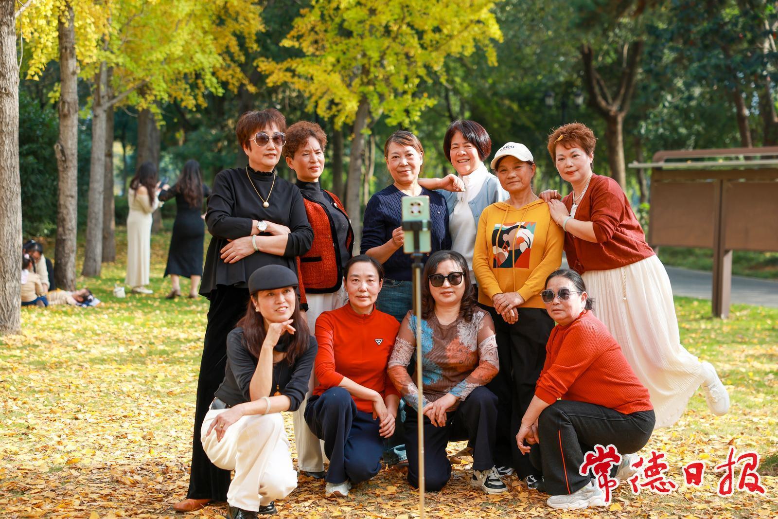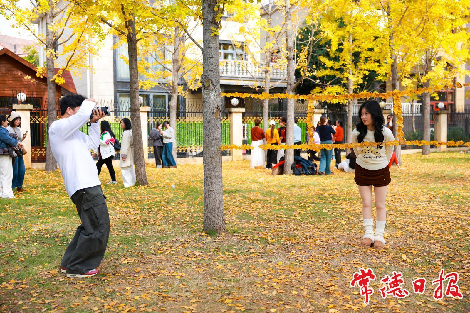 在银杏林里市民自拍打卡