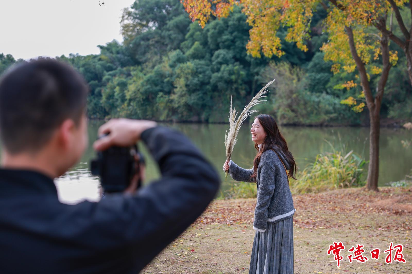 女士手持一束芦苇,亭亭而立,身后是黄绿相间的乌桕树,一旁平静如镜的湖水倒映着树影。四周仿若被大自然打翻了调色盘,五彩斑斓,满是暖冬的氛围