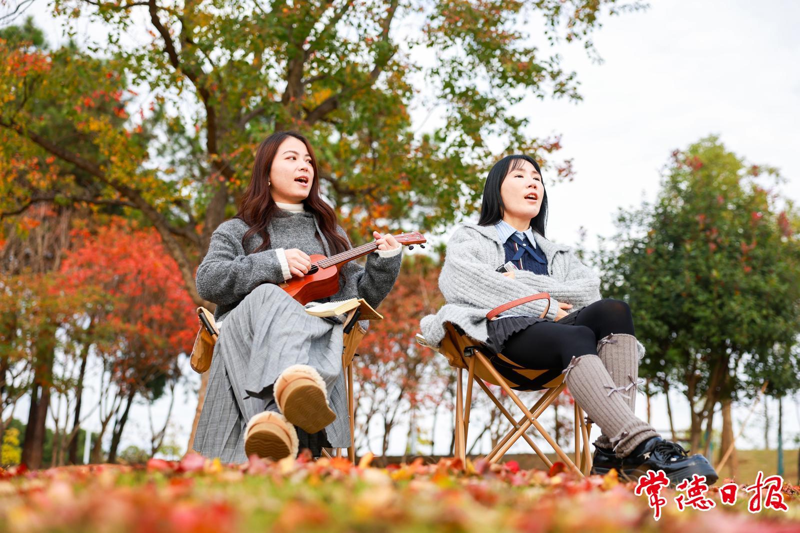 在铺满乌桕叶的草地上,市民手持尤克里里,纵情高歌,悠然享受这冬日时光