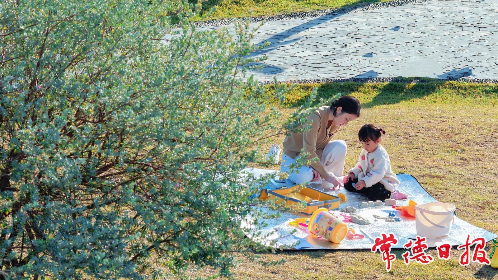 市民带着孩子在沙滩公园享受冬日暖阳