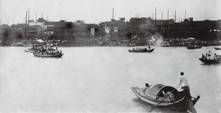 津市河面渡船往来景象,足以印证其时津市人流众多,经济活跃,南来北往者络绎不绝。(摄于1902—1908年间)