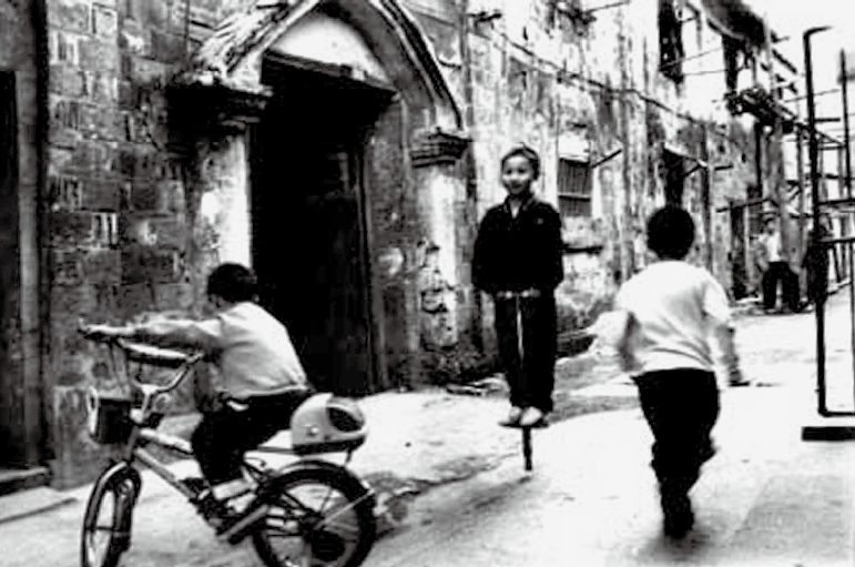 拐子巷里玩耍的小孩,弧形门楣的建筑便是闻名遐迩的原大华旅社。沈志勇 摄