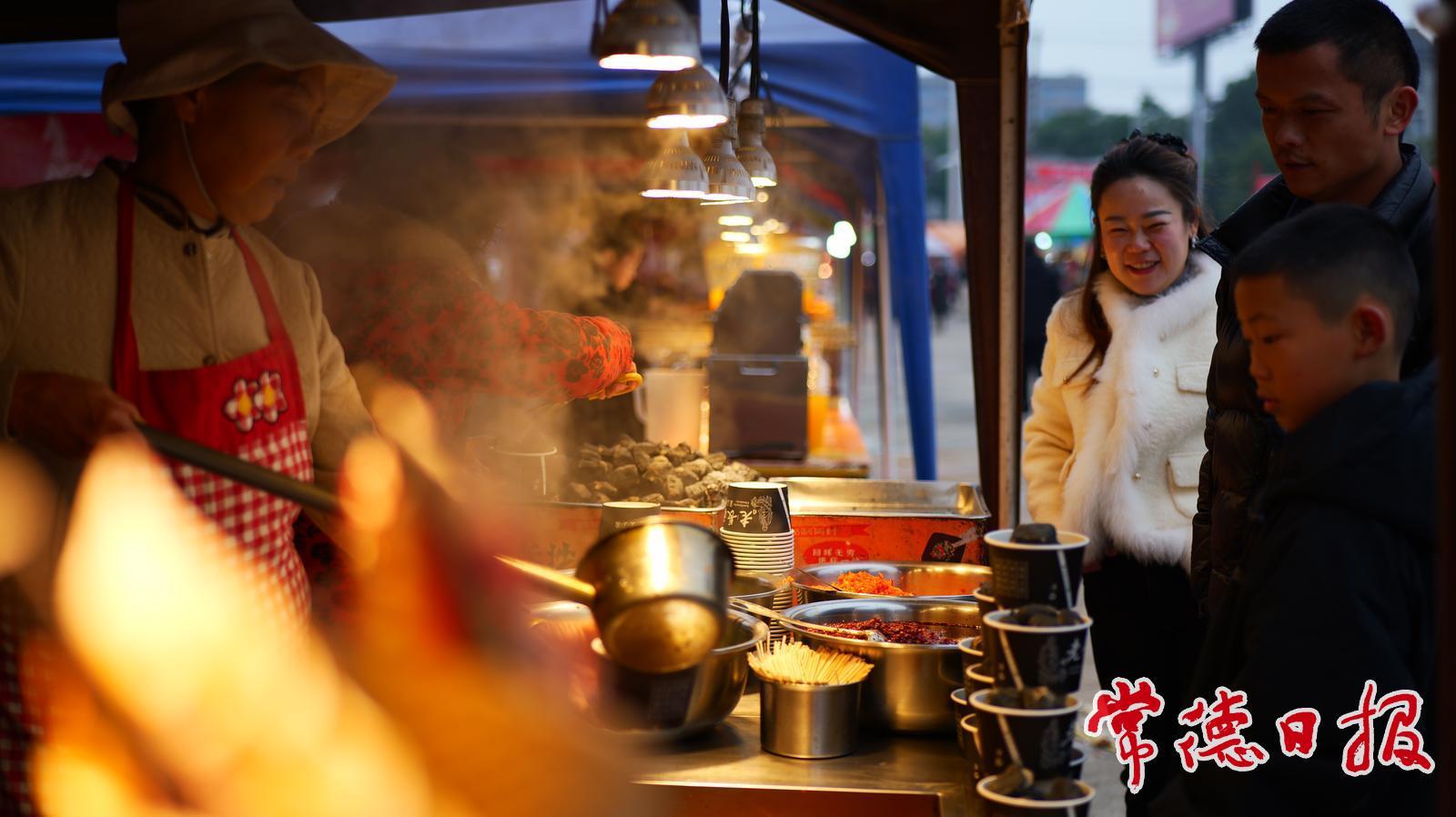 现场除了全县各乡镇的特色农产品、非遗手工艺品,众多鞋服企业的参展也为年货节注入了现代商业元素,特别是百钵炖粉宴环节——百口陶钵在展台上整齐排开,“咕嘟咕嘟”炖煮着热腾腾的常德米粉,醇厚香气随热气弥散开来,吸引众多市民驻足品尝、购买,将传统美食与新潮市集形式巧妙结合,成为节会中一道充满烟火气的风景线。