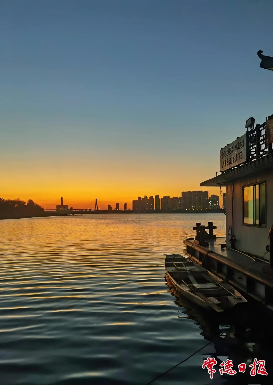 在沅江边等一场日落,看橙黄装进蓝调,江面被落日染成流动的金箔,远处城市建筑在橙蓝渐变的天色里化作温柔剪影,江风里都是松弛的烟火气。