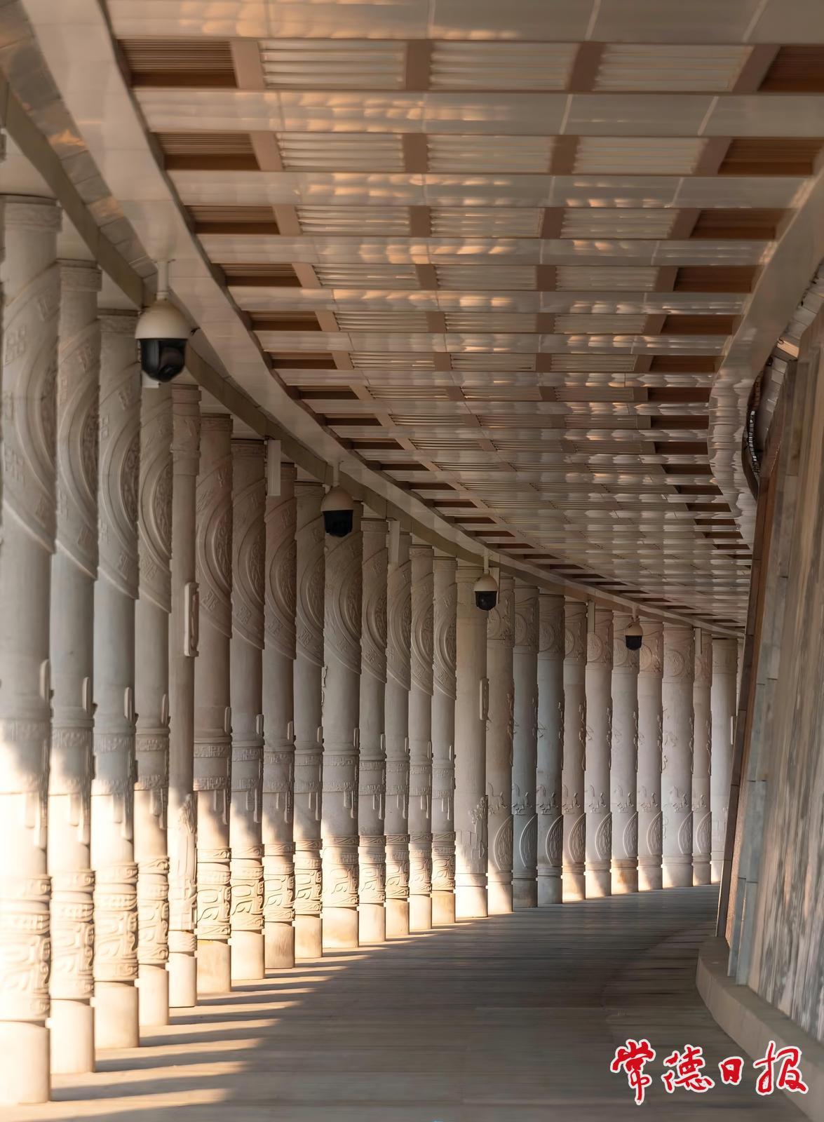常德画墙长廊里,阳光穿过雕纹石柱,织出一片流动的光影。一边是百米长的艺术画墙,一边是江风拂面的松弛,跑步、散步、摄影都成了和艺术的双向奔赴。