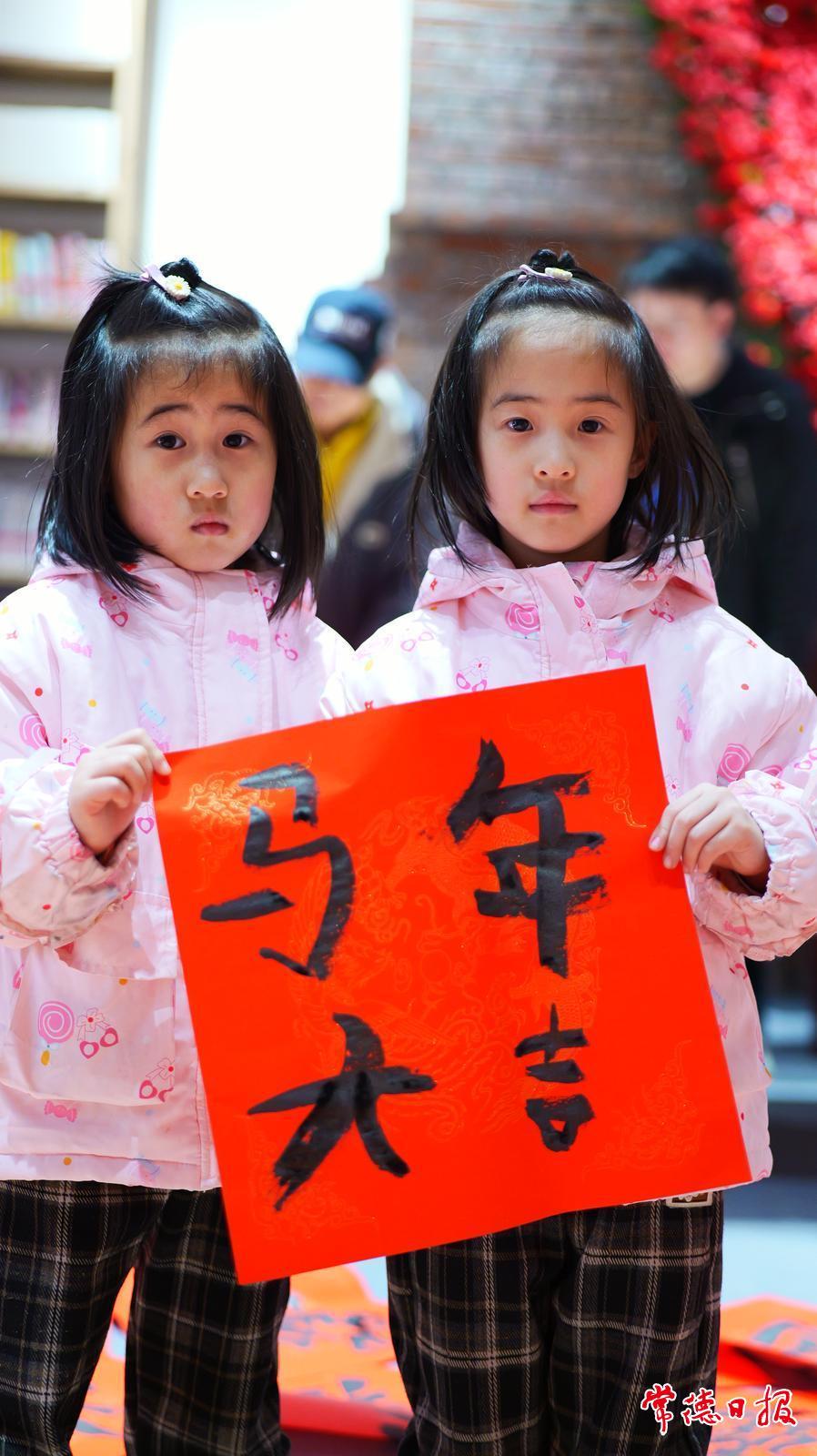 书写现场,书法家们挥毫泼墨,为群众书写春联。不少群众闻讯赶来,有的拿出中意联句请书法家书写,有的自拟内容只为讨个新年好彩头,在志愿者的引导下,大家有序领取和晾干春联。