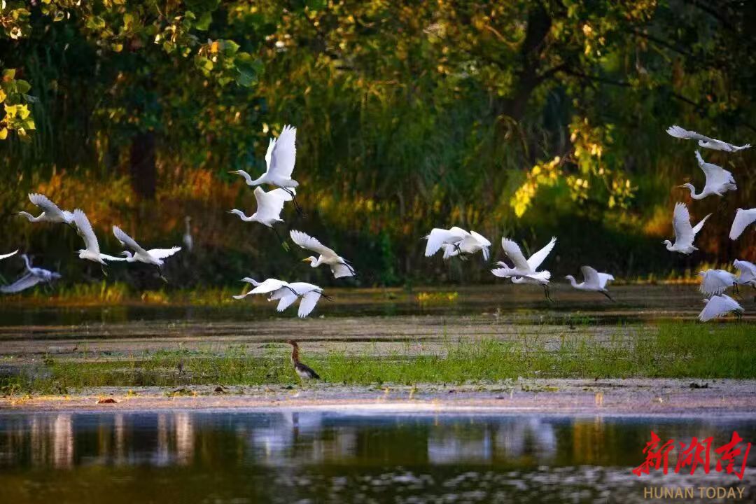 湖南毛里湖国家湿地公园,白鹤翩然起舞。这里是水鸟的天堂,262种湿地动物在此繁衍生息,漫步其间,水草间游鱼倏忽,芦苇丛中鸟鸣清越,每一次呼吸都浸润着湿润草木的芬芳。津市融媒 供图