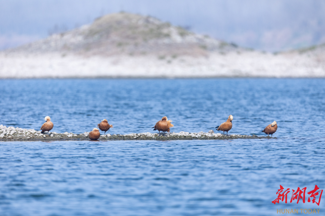 3月18日,沅水国家湿地公园,一群赤麻鸭正在浅滩处嬉戏觅食,橘色的胸羽与清澈的湖水相映成画。它们时而悠闲踱步,时而扑翅戏水,俨然这片水域的主人。周桂成 摄