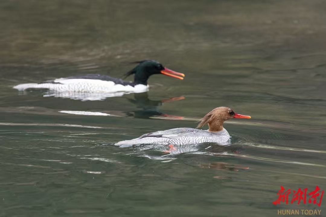 沅江桃源段流域,“鸟中大熊猫”中华秋沙鸭正在水中捕食。近年来桃源县加强对沅水、夷望溪等重要湿地生态系统的监测与修复,沅水湿地公园的水鸟种群已达到了54种,中华秋沙鸭等珍稀候鸟“稀客”变“常客”。周桂成 摄