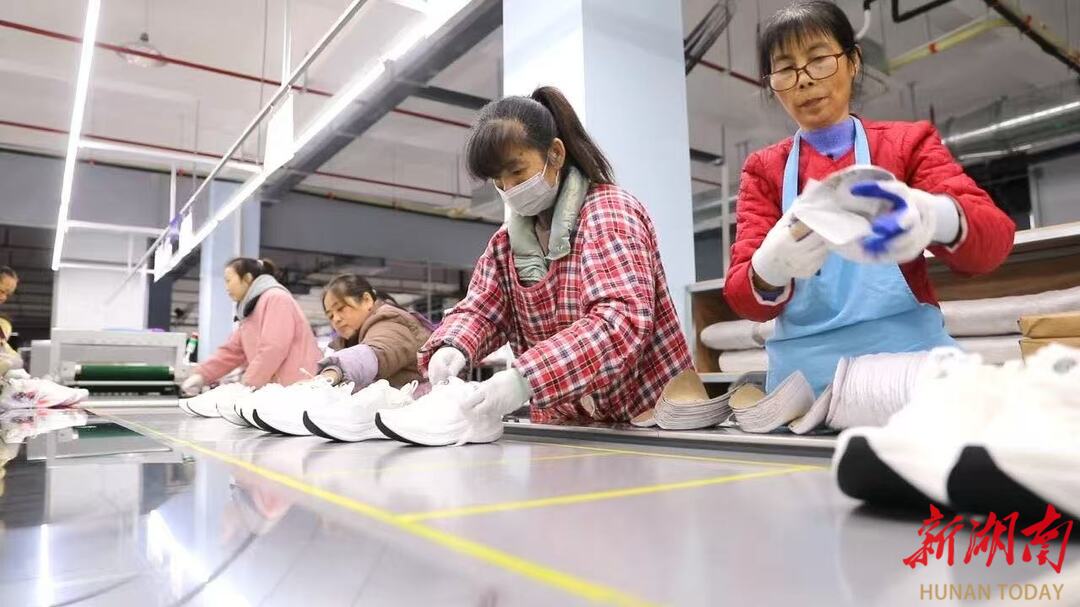 3月16日,桃源高新区必迈运动产业园,工人正在生产线上忙碌。必迈运动产业园2025年落户桃源,总投资约5亿元,目前2条生产线已投产,预计2027年全面达产,年产能达500万双。近年来,桃源县重点打造运动制鞋产业,目前产业链链上企业已达54家,年产值近50亿元,正朝着建设“中部鞋都”美好蓝图大步迈进。“桃源制鞋工”省级劳务品牌享誉三湘。桃源融媒 供图