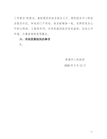 工作要点”的要求,督促建设好政务服务大厅、便民服务中心的政 务服务专区,和政府门户网站、政务新媒体一起,发挥好政务公 开的主阵地、主渠道作用,向市民提供政府信息查询、信息公开 申请、办事咨询答复等服务。 六、其他需要报告的事项 无。 常德市人民政府 2020 年 3 月 12 日 - 11 -