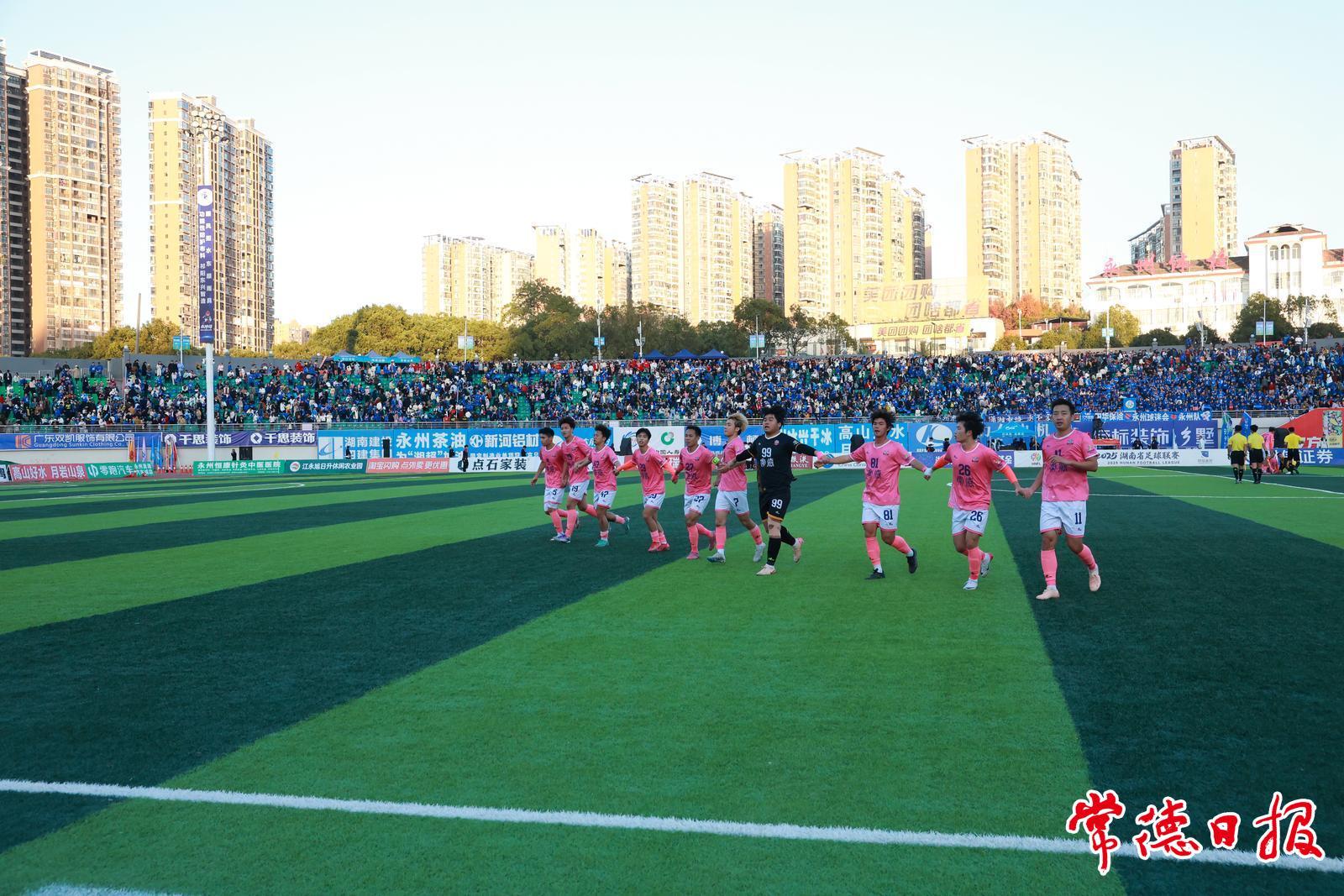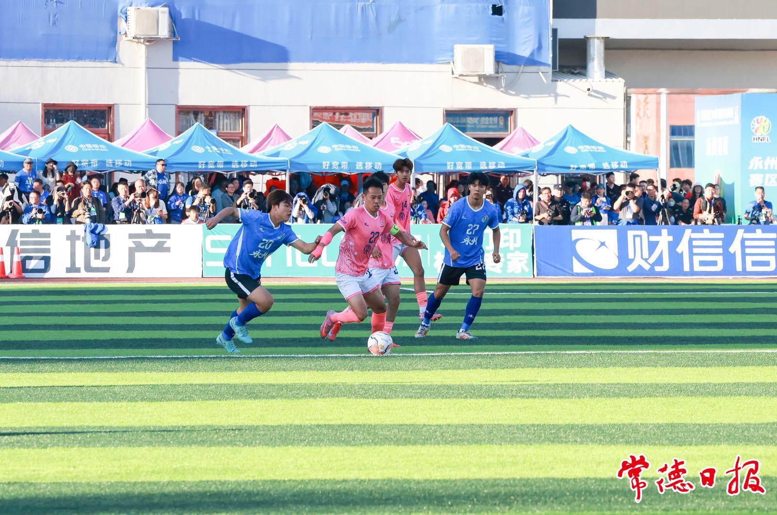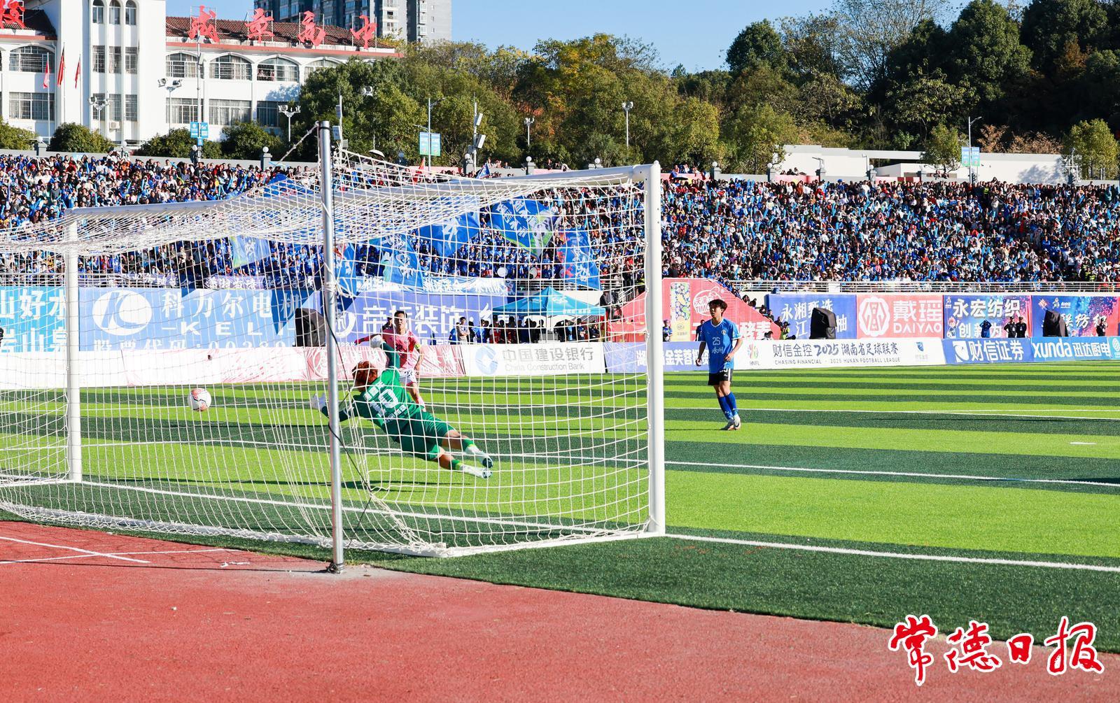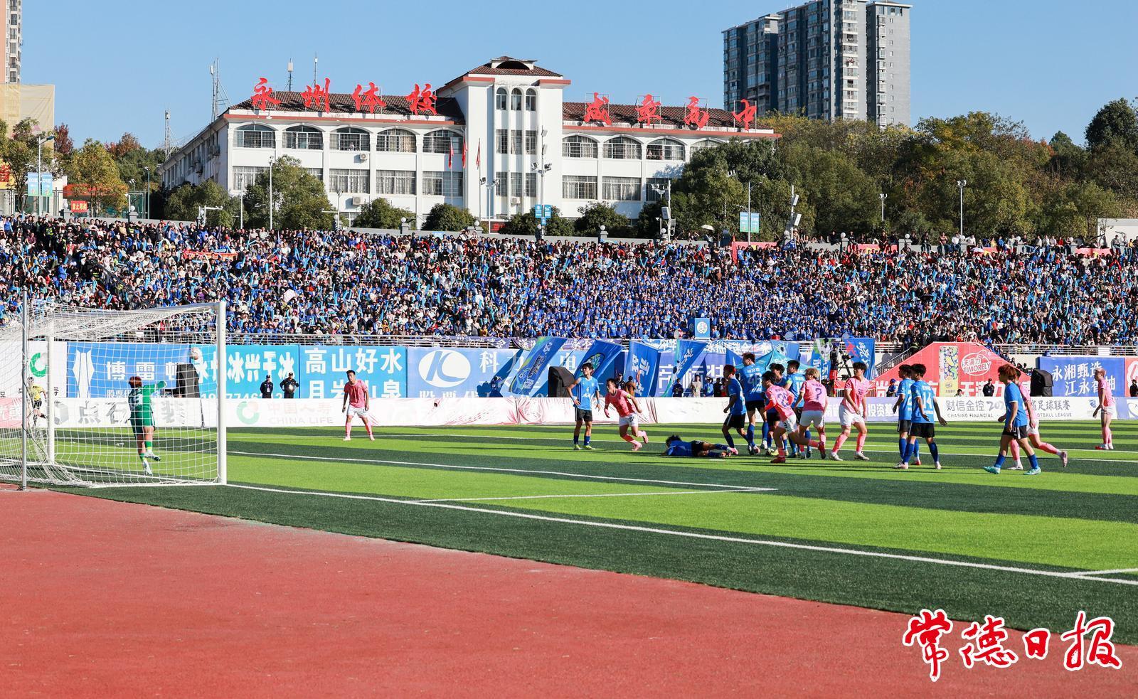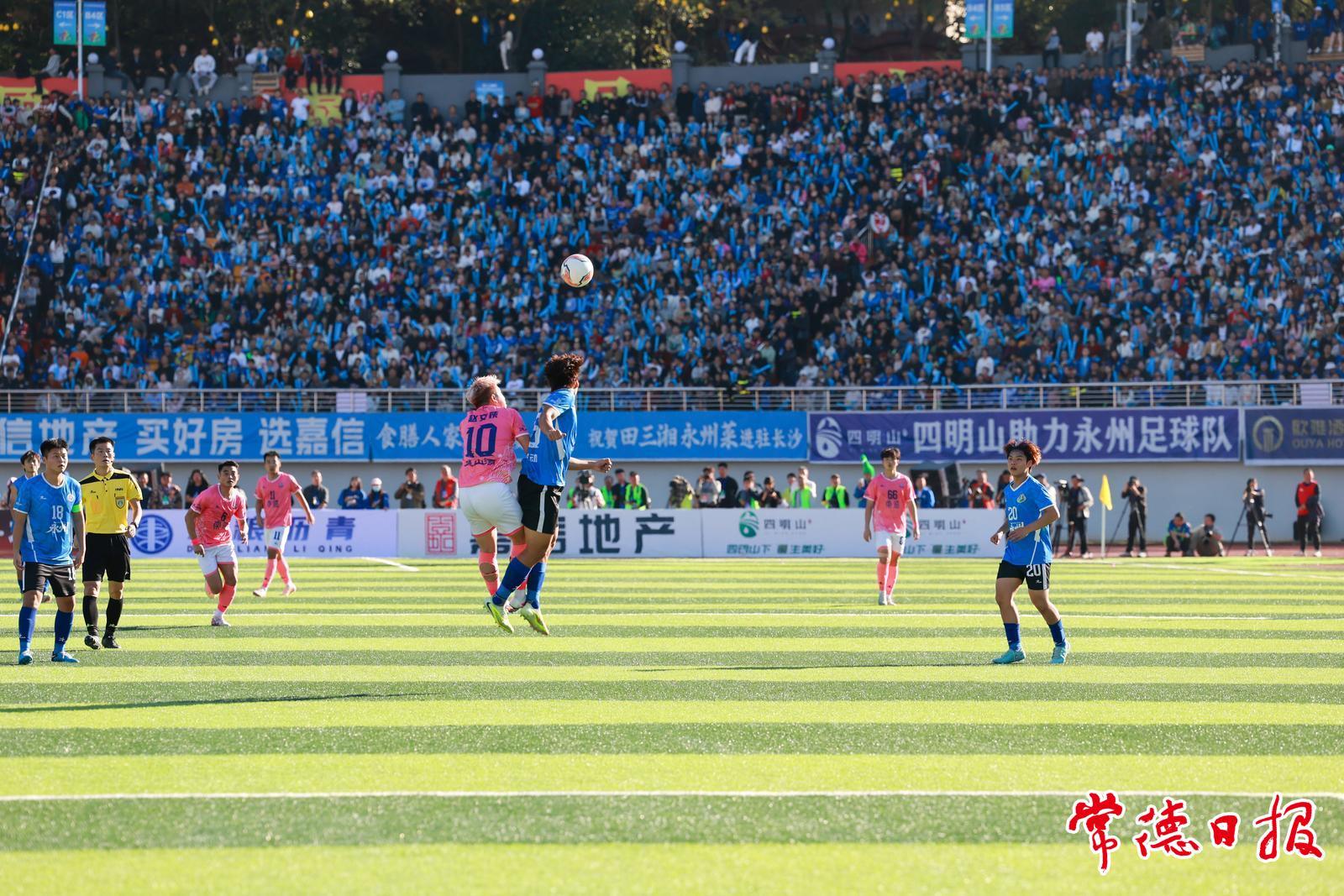 比赛进行到第26分钟,常德队球员赵文荻利用前场任意球的机会,攻破永州队球门,双方1∶1战平