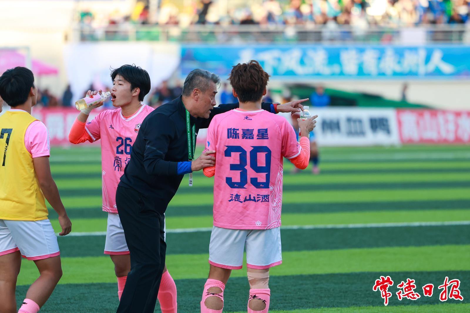 下半场,常德队凭借精彩表现领先一球。此时,主教练赵旭东赶忙走到场边,向球员认真叮嘱战术与注意事项