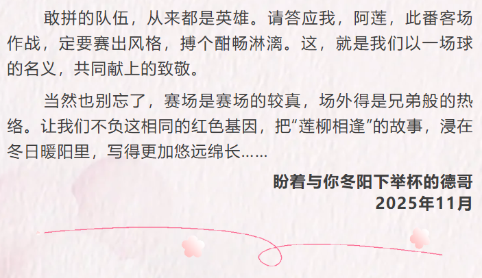 犹记你首个主场迎战长沙,万人齐唱《东方红》,何等威武豪迈,那穿越时空的红色回响直冲云霄,让人恍惚见着岁月里的初心模样。将沅澧潮涌的英雄气融入城市血脉的我,自然与你心跳同频、隔空呼应。赛场上,每一次倒地仍伸脚抢断的倔强、每一声落后时不认输的嘶吼,都是从先辈们热血里传承的执着与不屈,是对脚下这片土地最深沉的热爱,更是你我最鲜明的精神印记。