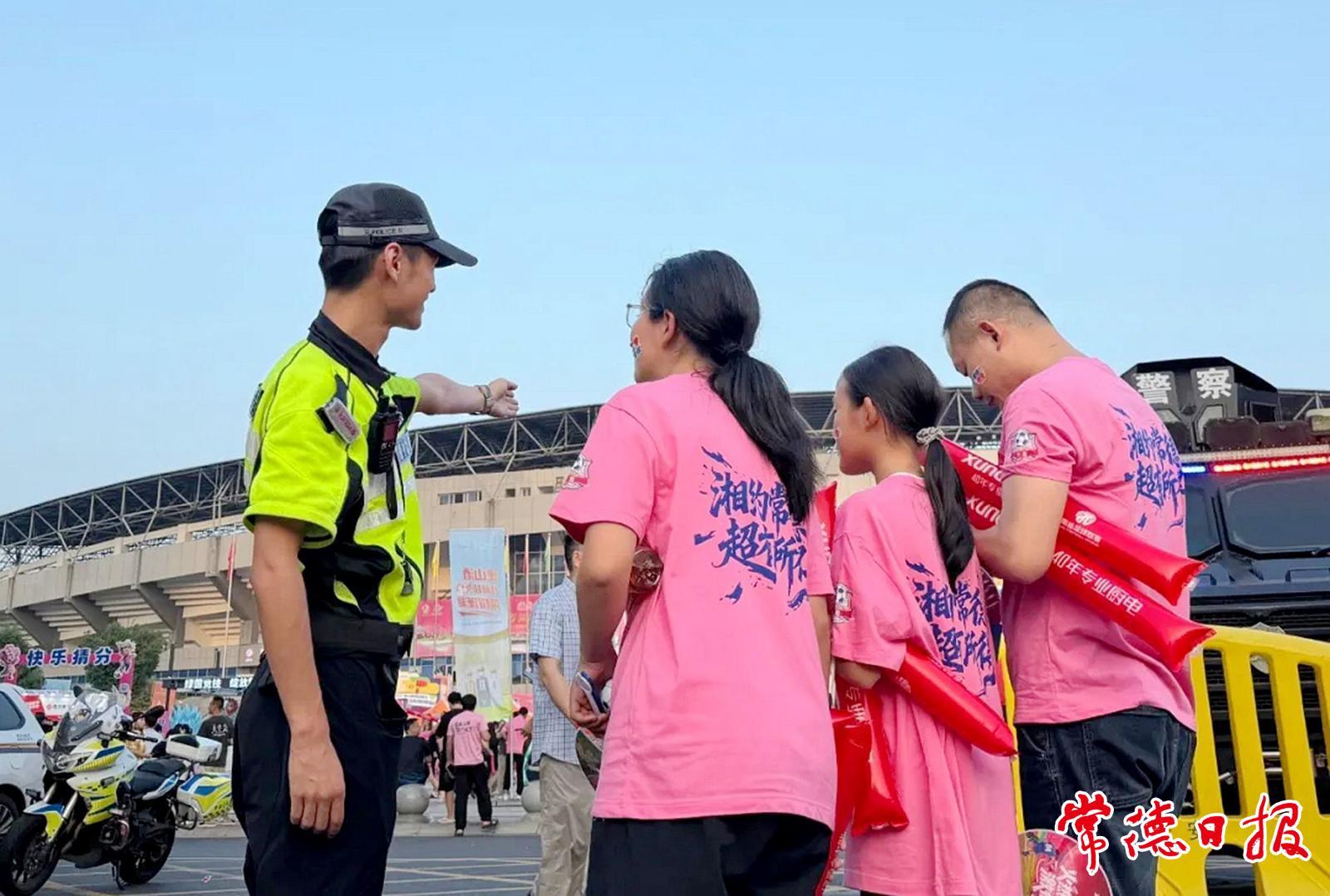 为编织好赛事交通安全网,常德市公安局交管支队按照“三圈一线”的交通安保理念,提前制定了核心封控圈、中心管控圈、外围分流圈,以及主客队和球迷进出场路线牵引保障的精密交通管制措施。常德公安交管部门每次出动300余名警力,采取以辖区大队警力为主+支队机关和各大队支援警力为辅,以及“定点驻守+机动巡查”的双保险模式,精准化解车流压力,重点对体育中心场内及出入口、武陵大道(柳叶大道至滨湖段)、兴民街(朗州路至武陵大道段)实行交通管制。执勤警力赛前提前4小时对体育中心内部车辆清场,提前3小时对道路进行清场,热情引导出租车、网约车远端上下客,即停即走,全力维护道路交通畅通有序。