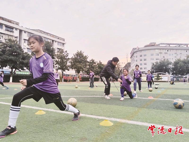 武陵区乾明路小学每周开展一节足球课,体育老师从基础技术到赛事规则系统授课。