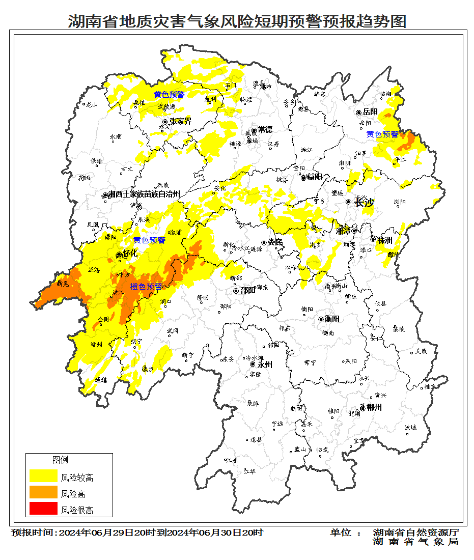 根据地质灾害成灾规律和孕灾条件,结合2024年6月29日短期气象预报情况,省自然资源厅与省气象局联合会商得出如下结论:自6月29日20:00至30日20:00,受降雨影响,湘西、湘东北部分区域发生突发性地质灾害风险高(橙色预警),湘中以北、湘西大部分区域发生突发性地质灾害风险较高(黄色预警)。