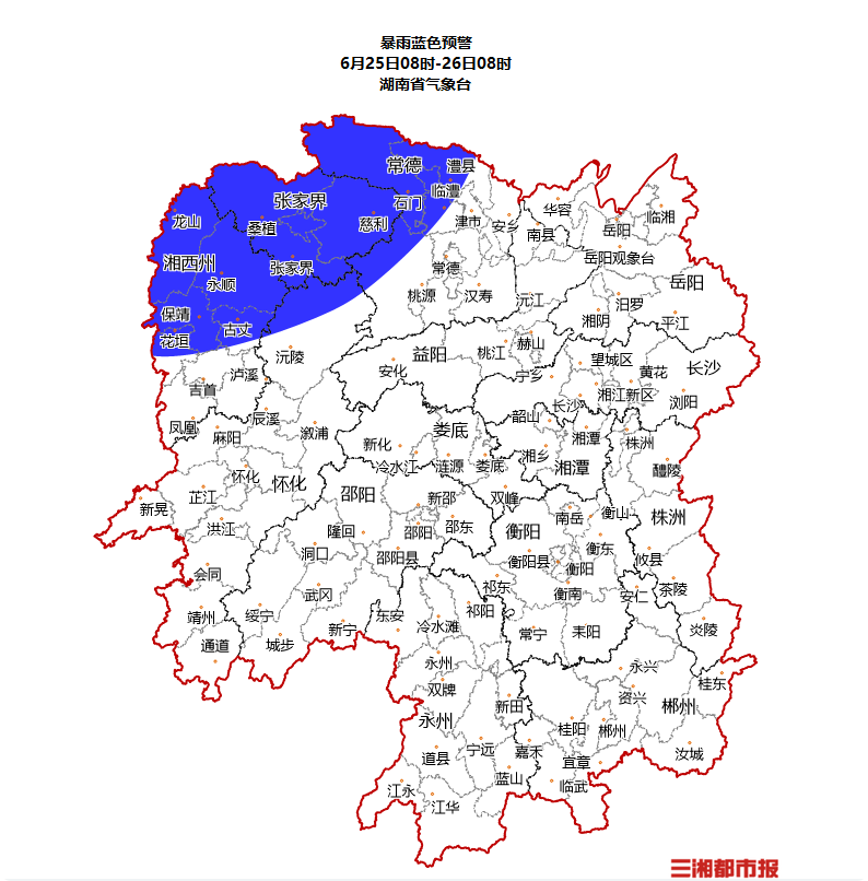三湘都市报·新湖南客户端6月25日讯(全媒体记者 李致远)湖南省气象台6月25日06时发布暴雨蓝色预警:预计25日8时至26日8时,湘西北地区将出现暴雨,其中常德、张家界、湘西州局地有大暴雨(100~150毫米),并伴有短时强降水(最大小时雨强50~80毫米)、雷雨大风(局地阵风7~9级)等强对流天气,请加强防范。