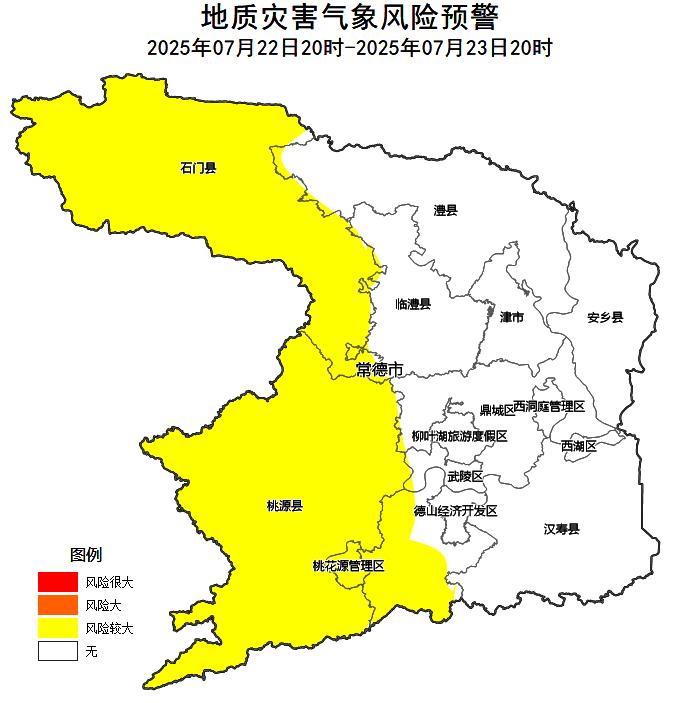 根据地质灾害成灾规律和孕灾条件及短期气象预报情况,7月22日11时,常德市自然资源和规划局、常德市气象局联合发布地质灾害气象风险黄色预警:7月22日20时至7月23日20时,桃源县全境、桃花源管理区、石门县全境、鼎城区西部发生突发性地质灾害的风险较高(黄色预警)。