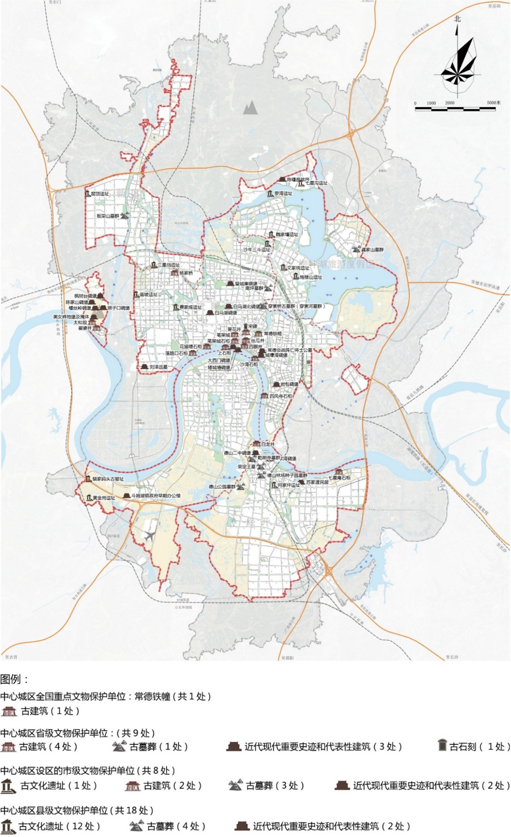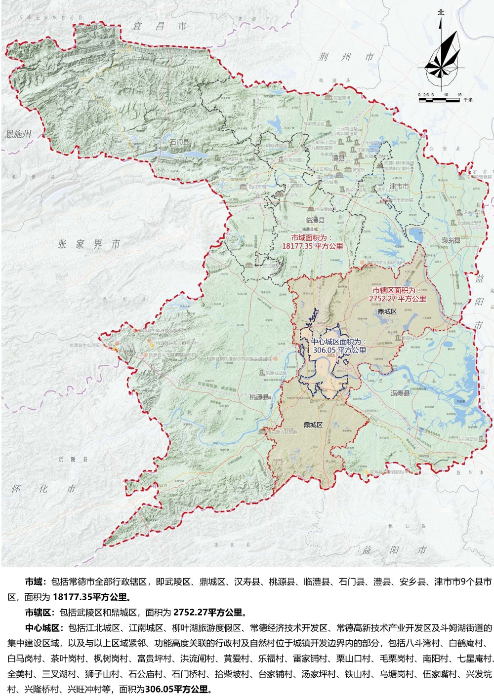 中心城区:包括江北城区、江南城区、柳叶湖旅游度假区、常德经济技术开发区、常德高新技术产业开发区及斗姆湖街道的集中建设区域,面积为306.05平方公里。侧重于依据实际情况,优化或调整中心城区内文保单位的“两线”范围。