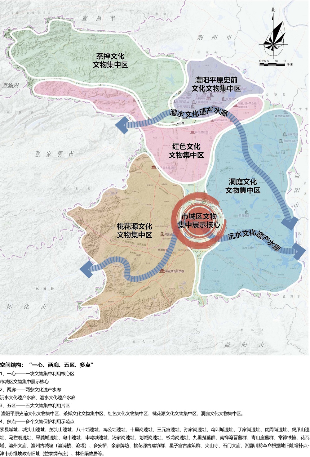 澧阳平原史前文化文物集中区、茶禅文化文物集中区、红色文化文物集中区、桃花源文化文物集中区、洞庭文化文物集中区。