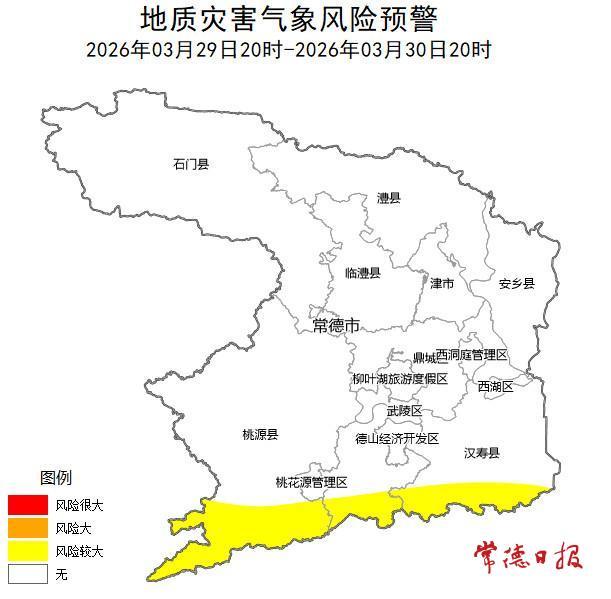 根据地质灾害成灾规律和孕灾条件及短期气象预报情况,3月29日15时,常德市自然资源和规划局、常德市气象局联合发布地质灾害气象风险黄色预警:3月29日20时至3月30日20时,桃源县西南部、鼎城区南部、汉寿县南部发生突发性地质灾害的风险较高(黄色预警)。